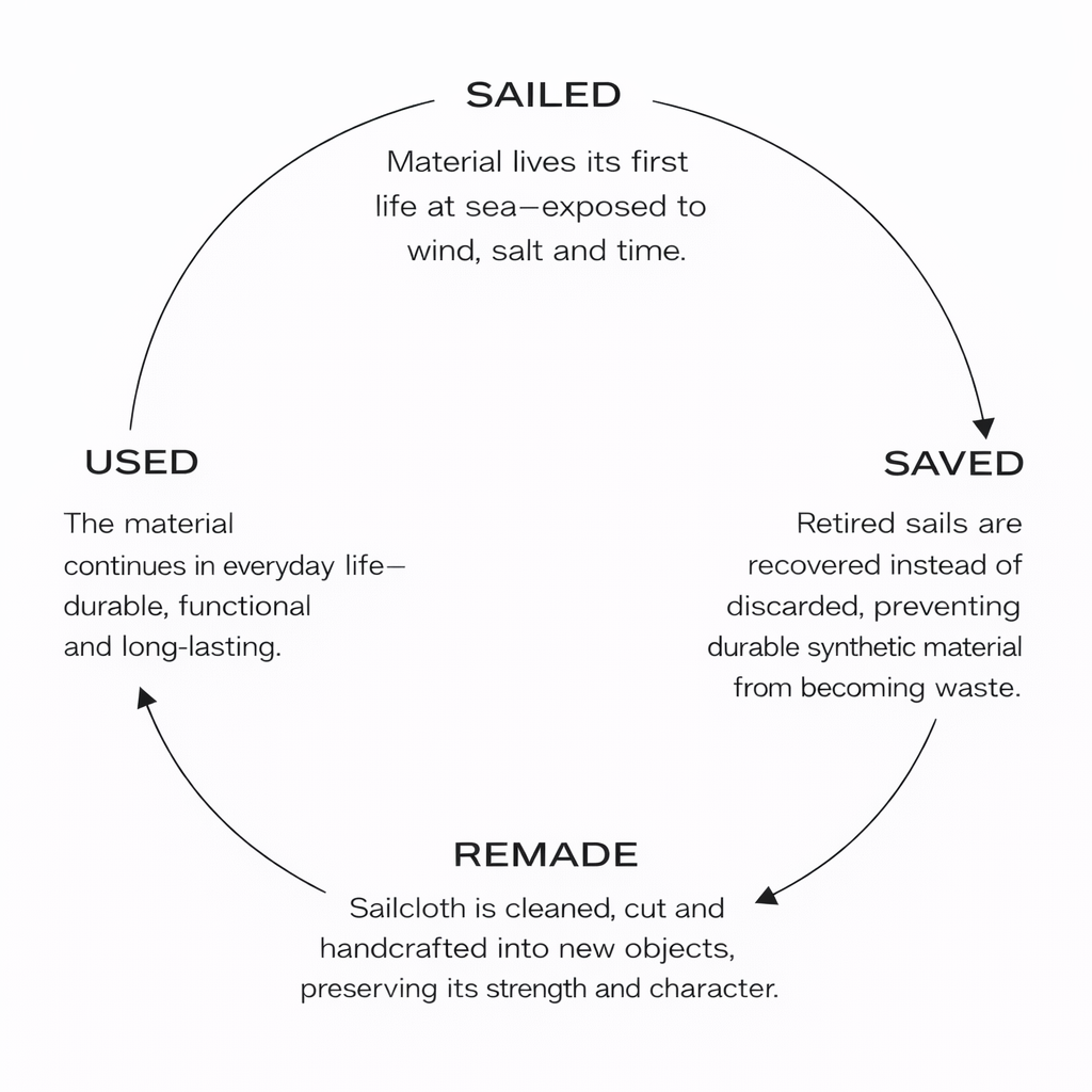 Before it became a bag, it was a sail — shaped by wind, salt and time. When its life at sea ended, the material remained strong and full of character. Instead of discarding it, we gave it a new purpose.